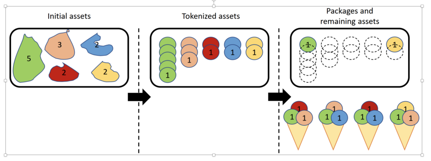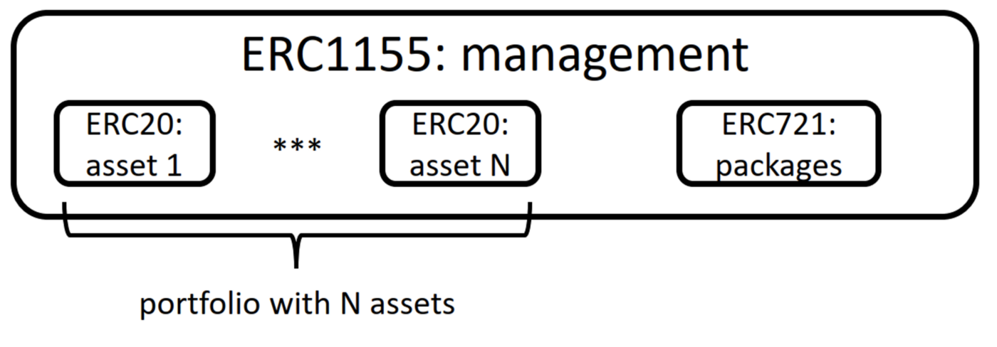 Смарт-контракт для токенизации предназначен для выполнения двухэтапной процедуры, описанной выше, в цифровом виде. Владелец портфеля развертывает смарт-контракт для управления токенизацией. Контракт касается различных типов токенов и может быть основан на ERC1155. Владелец портфеля создает цифровой двойник для каждого актива в портфеле. Мы предполагаем, что стоимость активов указана в базовой валюте владельца, т.е. ДОЛЛАР США. Все равные части стоимости каждого отдельного актива взаимозаменяемы, как и базовая валюта. Таким образом, первоначальная токенизация создает взаимозаменяемый тип токена для каждого актива, количество токенов равно стоимости активов, и дополнительная эмиссия не допускается.